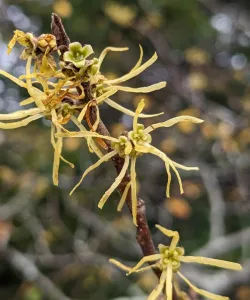 Witch Hazel is a distinctive native shrub known for its pretty clusters of spidery yellow flowers that bloom exceptionally late into the year, typically in late fall or even early winter, adding a unique burst of color to the cooler months. This unique bloom time sets it apart from most other flowering plants. Witch Hazel's leaves often turn vibrant shades of yellow and orange in the fall, further contributing to its visual appeal. This hardy shrub is adaptable to a variety of soil types and can thrive in both full sun, part shade, and even some full shade.