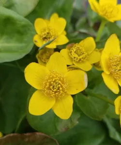 Marsh Marigold blooms with bright yellow, buttercup-like flowers in mid-spring. This plant's preference for moist to wet soil and almost any sun exposure makes it an excellent choice for rain gardens, pond edges, and areas with poor drainage. It's a popular and great low-growing choice for attracting pollinators like bees and butterflies and its shiny, rounded leaves provide an attractive foliage backdrop even when it's not in bloom. Not to be confused with the very similar appearing but highly invasive Lesser Celandine (Ficaria verna), which grows in similar conditions as Marsh Marigold but tends to bloom about a month earlier (around March or early April instead of April and May).