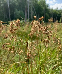 This is a captivating native grass with a unique appearance and remarkable contributions to wetland ecosystems. Its distinctive clusters of brown flower terminal spikes resemble woolly tufts, giving it a charming and distinctive look. These flower clusters emerge in summer and persist through early fall, adding intriguing texture to wetland areas and rain gardens. Reaching heights of 2 to 4 feet, Wool Grass showcases a clumping growth habit with graceful arching stems. Its ability to thrive in wet, even acidic earth, makes it a natural choice for stabilizing soils, improving water quality by filtering runoff, and providing habitat for diverse aquatic wildlife.