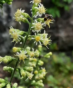 Zigzag Goldenrod thrives in partial shade to full shade with moist, well-draining soil. This plant typically grows 1 to 3 feet tall with an arching, zigzagging stem that lends the plant its name. Its lance-shaped leaves are a deep green color and alternate along the stem, adding an elegant touch to the garden. In late summer to fall, when most other plants are done blooming, it produces clusters of small, bright yellow flowers that offer critical support to pollinators.