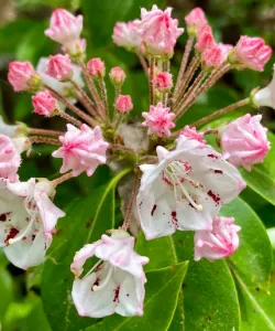 Mountain Laurel is a captivating evergreen shrub that adds elegance to gardens and landscapes. Thriving in partial shade to full sun, this plant prefers acidic, well-draining soil and is often found in woodland settings. Its glossy, dark green leaves provide year-round interest, while its stunning clusters of cup-shaped flowers bloom from late spring to early summer. These flowers showcase a wide range of colors, from white to shades of pink and deep rose, attracting pollinators like bees and butterflies.