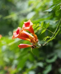 Trumpet Creeper (Campsis radicans) is a vigorous and visually striking vine known for its vibrant trumpet-shaped flowers and adaptability to various growing conditions. New Jersey marks the northernmost reaches of its known native range, though it has been introduced and naturalized elsewhere. Thriving in full sun to partial shade, this vine is adaptable to different soil types, including well-draining sandy or loamy soil. Trumpet Creeper Vine displays rapid growth and a climbing habit, often reaching heights/lengths of 30 to 40 feet or more. Its attractive compound leaves, composed of smaller leaflets, provide a dense canopy of green foliage. During summer, the vine bursts into bloom with clusters of brilliant orange-red trumpet-shaped flowers that are highly attractive to hummingbirds and other pollinators.