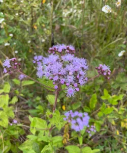 Blue Mistflower is a charming native perennial that produces clusters of fluffy, powder-blue flowers from late summer through fall. Blue Mistflower normally grows to a height of one to two and a half feet. This plant's vibrant blossoms and ability to thrive in various soil types, including moist soils and clay, make it a valuable addition to gardens and landscapes. Its nectar-rich blooms will attract butterflies and other pollinators to the more dappled to full sun areas of your yard.