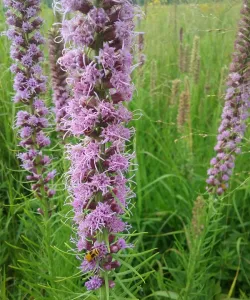 Dense Blazing Star, also called Marsh Blazing Star, makes an immediate impression with its tall spikes of vibrant, deep purple to bright mauve flowers. This plant starts the year forming thin, grass-like leaves before shooting up its flowering stem. Post-bloom, blazing star seeds are readily available for local birds to eat. Thriving in sunny habitats with wet soils, this herbaceous perennial is a magnet for bees, butterflies, and seed-eating bird species, making it an excellent choice for gardens designed to support local ecosystems.