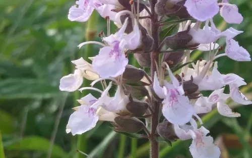 American Germander produces attractive white flower spikes in mid-summer and glossy green foliage The lower petal of each flower is enlarged, providing a passage for pollinators to walk inside of the flowers. Easy to grow and prefers wetter conditions. The bitter foliage is very deer resistant. American Germander looks best in a clump, but like other members of the mint family this plant spreads, getting wider and wider at the base. Divide periodically to keep it in check.