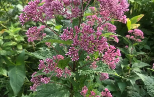 Coastal Joe Pye Weed is a charming presence in the garden, donning six-inch domes of fuzzy pink flowers in late summer that are absolute butterfly magnets. Its upright, burgundy stems add structure to the garden. This species is rather shorter than other Joe Pye Weeds, and faces fewer issues with stems flopping over. Birds eat the seeds and use the fluffy seed material to line their nests. Thriving in wet environments, it can show signs of stress if allowed to dry out. Coastal Joe Pye weed can self-sow in the garden. Pull seedlings in spring to reduce its spread.