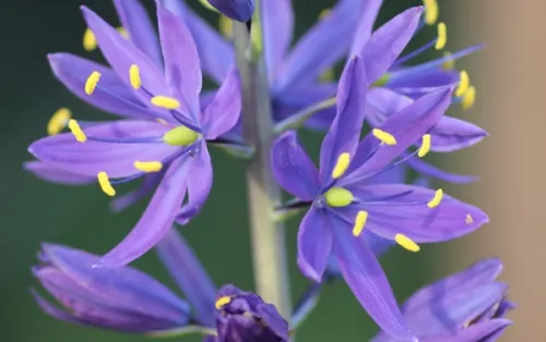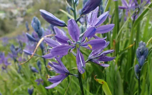 Common Camas is a perennial bulb native to North America, particularly celebrated for its cultural significance and ecological value. It grows 1 to a little over 2 feet tall, producing clumps of grass-like leaves that provide a lush, green backdrop in early spring. As spring progresses into early summer, tall spikes of vivid blue to deep purple flowers emerge, each composed of six-petaled star-shaped blooms. These flowers are not only a favorite among gardeners for their striking appearance but also attract bees, butterflies, and other pollinators. Common camas thrives in full sun to partial shade and prefers moist, well-drained soils, making it ideal for rain gardens, water edges, and perennial borders.