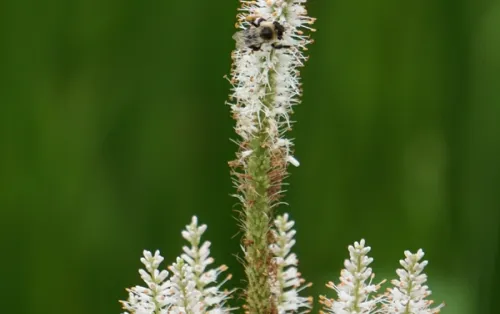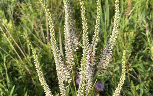 Culver's Root is a great architectural plant in the garden. Initially slow growing, it matures into a large plant with star-shaped whorls of leaves topped by long, white flower spikes. The plant resembles a large candelabra when it blooms in early summer and is very attractive to pollinators. It is prone to powdery mildew, a non-serious leaf disease that turns leaves white, so it looks best when tucked behind or within other flowers. The plant is sturdy when grown in the sun, but in a part shade garden it needs staking or can be cut back in early summer to reduce the height.