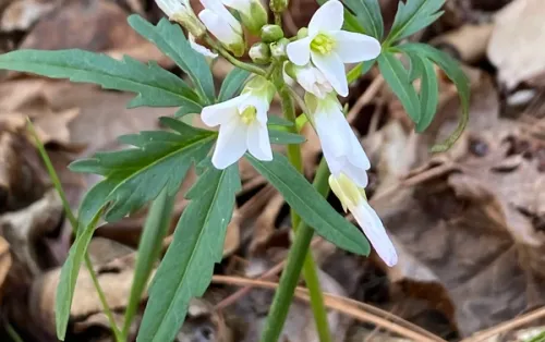 Cutleaf Toothwort is a delicate spring ephemeral that blankets woodlands with clusters of dainty white flowers. Its deeply lobed leaves form a lush carpet on the forest floor. Blooming in early spring, Cutleaf Toothwort attracts early pollinators with its nectar-rich flowers before going dormant in summer. This woodland gem thrives in shaded to partially shaded areas with moist, well-drained soil, making it an ideal choice for naturalizing beneath deciduous trees. With given its ephemeral nature, don't be alarmed Cutleaf Toothwort seems to vanish before summer even arrives - it will be back again with spring the following year!