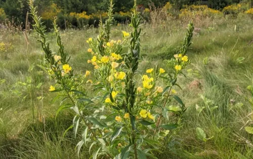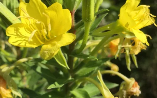 Evening Primrose, is a distinctive biennial that features robust, sprawling growth and can reach up to 4 feet in height. Its bright yellow flowers bloom from late afternoon until morning, filling the air with a sweet fragrance that attracts nocturnal pollinators like moths. The flowers are supported on tall, sturdy stems that emerge from a rosette of lance-shaped leaves. This plant thrives in full sun and well-drained soils, making it a versatile addition to wildflower meadows, borders, or naturalized areas where its night-blooming flowers can be fully appreciated.