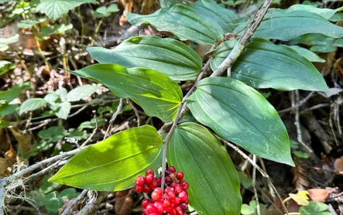 False Solomon's Seal, also sometimes called Solomon's Plume, is a perennial woodland plant that adds elegance to shaded garden areas. It grows to about 1 to 3 feet in height and spreads with rhizomatous roots to form clumps. The plant features long, arching stems with alternate, lance-shaped leaves that create a dense and leafy appearance. In late spring, it produces terminal clusters of small, fragrant, white flowers that are a magnet for pollinators such as bees and butterflies. By fall, these flowers give way to bright red berries, providing food for birds and small mammals. The foliage also turns a golden-yellow in autumn, offering extended seasonal interest.