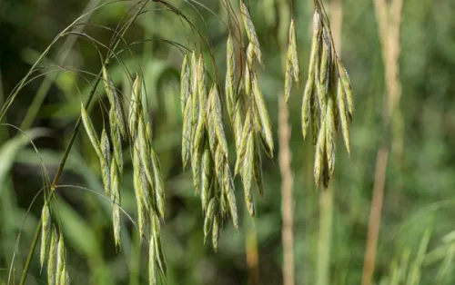 Fringed Brome is a native perennial grass that stands out with its elegant, arching form and fine-textured foliage. Throughout summer, it produces long, feathery seed heads that nod gracefully in the wind, providing a dynamic element to the landscape. This grass is particularly effective in mass plantings or as an accent in a mixed border, where its delicate structure contrasts nicely with more substantial plants. It thrives in both sun and partial shade, adapting well to a variety of garden settings.