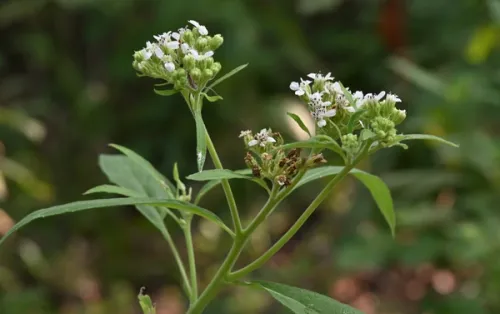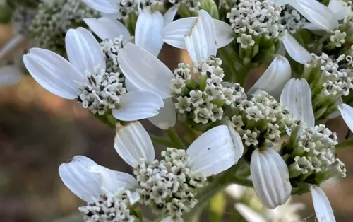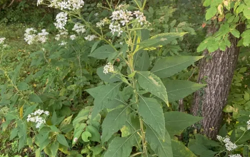 Frostweed, also called White Crownbeard, is a statuesque native perennial found in open woods and moist meadows across the Southeastern and Mid-Atlantic U.S. Reaching heights of 4–6 feet, it produces flat-topped clusters of white ray flowers in late summer and into fall—just when many other flowers are fading. These blooms attract a variety of late-season pollinators, including monarchs fueling up for migration. After frost, its stems create “frost flowers”—delicate ice ribbons that curl from the base like spun glass, making it a standout even in dormancy. Frostweed spreads by seed and rhizomes and is best suited for naturalistic plantings or the back of large garden beds where it has room to roam.