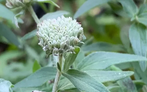 Hairy Mountain Mint is highly valued for its ability to attract an array of pollinators, including bees, butterflies, and other beneficial insects. This plant is characterized by its dense clusters of small, white flowers that bloom from mid to late summer. Each flower cluster is accentuated by silvery, hairy bracts that give the plant a frosted appearance. The leaves are narrow, slightly hairy, and emit a strong minty fragrance when crushed. Ideal for naturalistic plantings and pollinator gardens, Hairy Mountain Mint thrives in full sun to partial shade and adapts well to a variety of soil conditions.
