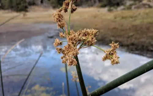 Hardstem Bulrush is a perennial sedge that thrives in water up to several feet deep. It is a vital component of riparian ecosystems, offering nesting sites and cover for birds and other wildlife, while its roots help stabilize banks and filter pollutants from water. The plant's dark green stems are topped with small, brownish spikelets in summer, which are often obscured by the dense foliage but contribute to the ecological health of wetland environments.