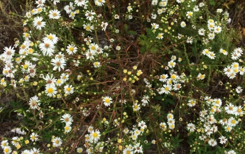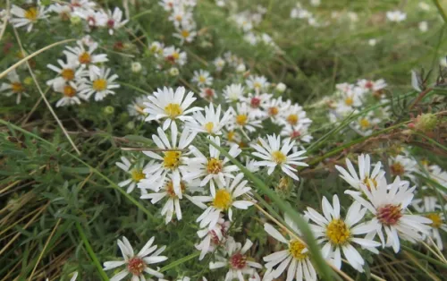Heath Aster is celebrated for its dense clusters of tiny, bright white flowers that appear in the fall, creating a striking visual contrast against its fine, needle-like foliage. This hardy perennial thrives in a range of conditions and is particularly effective in mass plantings where it can form a sea of white blooms. Its compact, bushy form also makes it suitable for garden edges and as a filler in mixed borders, providing late-season interest and supporting a host of pollinators.