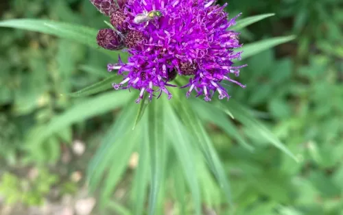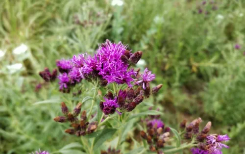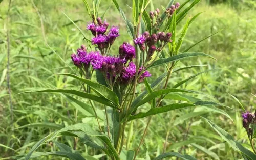Common Ironweed, features tall, sturdy stems topped with dense clusters of deep purple flowers. These showy blooms appear in late summer, creating a bold visual impact and serving as a nectar source for butterflies and other pollinators. The plant's lush, lance-shaped leaves add to its strong presence in the landscape. Common Ironweed thrives in moist, fertile soils, making it an ideal choice for naturalizing in wet meadows or incorporating into rain gardens where it can help manage water runoff.