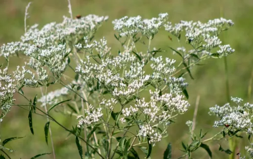Late Boneset features coarse, hairy leaves and a stiff, upright habit that can reach heights of around 5 feet. Its showy, flat-topped clusters of white flowers appear from late summer into fall, attracting a flurry of pollinator activity. This plant is ideal for naturalized areas, meadow gardens, and as a background plant in borders, where its late-season blooms provide essential support to local wildlife. Thriving in full sun to partial shade and moist, well-drained soil, Late Boneset is also noted for its adaptability to various environmental conditions.