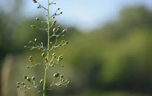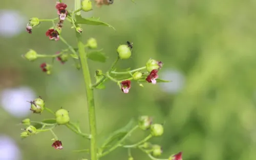 Late Figwort, also called Carpenter's Square, is a perennial forb that stands out in the garden with its architectural structure and intriguing flowers. It typically grows 3 to 6 feet tall, featuring coarse, green leaves and distinctive square-shaped stems. From midsummer to early fall, it produces small, globular, dark red to maroon flowers arranged in branching panicles. These flowers are highly attractive to hummingbirds, bees, butterflies, and other pollinators. Late Figwort thrives in partial shade to full sun and prefers moist, well-drained soil. It is often used in woodland gardens, naturalized areas, and along borders where its height and unique floral display can be appreciated.