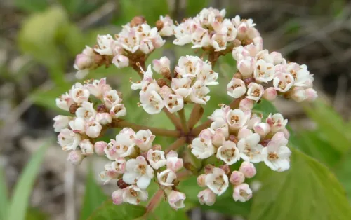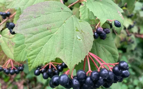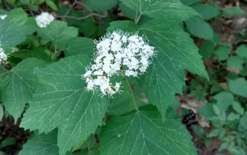 Mapleleaf Viburnum is a compact, deciduous shrub, typically reaching 4 to 6 feet in height. It thrives in the understory of forests, making it ideal for shaded or woodland gardens. In spring, Mapleleaf Viburnum produces small, white, lacey flowers in flat-topped clusters, which are highly attractive to pollinators such as butterflies and bees. These flowers mature into dark, blue-black berries by late summer, providing food for birds and small mammals. The leaves, resembling those of a maple tree, offer stunning fall color, making this shrub a four-season performer. Mapleleaf viburnum prefers well-drained, acidic soils and partial to full shade, making it a versatile choice for naturalized or formal garden settings.