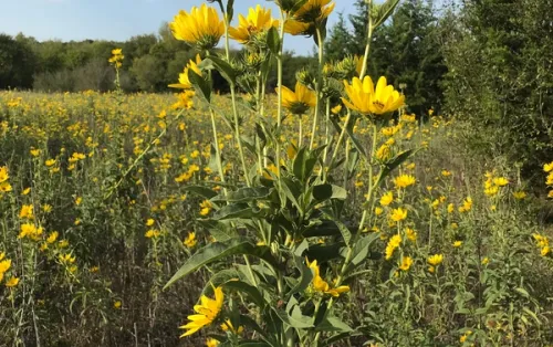 Maximilian Sunflower is a robust and beautiful native sunflower that can reach heights of 3 to 10 feet, making it an excellent choice for back borders, naturalized areas, and wildlife gardens. Its vibrant yellow flowers not only add dramatic vertical interest but also attract a wide range of pollinators. Many seeds develop after the last blooms and are devoured by seed-loving birds, particularly finches, in the fall and winter months. Thrives in full sun and well-drained soil and is highly tolerant of drought conditions, making it a sustainable choice for xeriscaping and other low-water-use landscapes.
