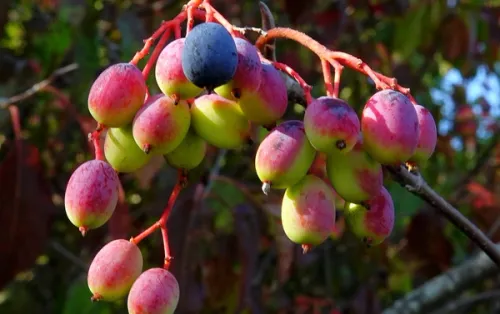 Nannyberry Viburnum, often referred to simply as Nannyberry, is a large, deciduous shrub or small tree that can grow up to 14 to 16 feet tall. It is noted for its upright and spreading habit, making it suitable as a screen or hedge. In late spring, clusters of creamy white flowers bloom, providing a nectar source for pollinators and a pleasant visual appeal. These flowers mature into deep blue-black berries in the fall, which are edible and highly favored by birds and wildlife. The leaves turn from a rich green to a stunning array of reds and purples in autumn, enhancing its seasonal interest. Nannyberry viburnum thrives in a variety of soil types, prefers full sun to partial shade, and is known for its adaptability to urban environments.