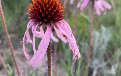 Narrow-Leaved Coneflower captivates passers by with spiky orange cones encircled by drooping purple petals in mid-summer. Resembling its cousin, the Purple Coneflower, but standing at just two feet in height, it thrives in dry soils and boasts impressive drought tolerance. As a preferred host for the threatened Ottoe Skipper, it attracts butterflies and becomes a vital habitat. Goldfinches find delight in its seeds, enhancing the ecological value of this adaptable and compact perennial.