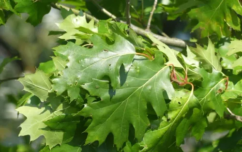 The Northern Red Oak is a towering and stately tree that can reach heights of 60 to 75 feet, with a broad rounded canopy, making it a dominant presence in any landscape. Northern Red Oak is also notable for its deeply lobed, glossy green leaves that turn a brilliant red in the fall. Like other oaks (genus Quercus), it produces acorns that are an important food source for birds, squirrels, deer, and other wildlife. Along with this, Northern Red Oak is a host plant for over 400 species of moths and butterflies, each of which feed on its foliage as caterpillars. Northern Red Oak adapts well to a variety of soil types, though it prefers slightly acidic, well-drained soils, and is ideal for urban parks, large gardens, and natural forest settings.