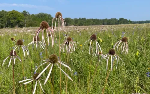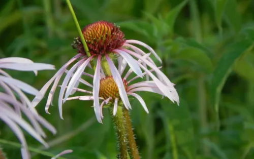 Pale Purple Coneflower is beloved for its unique and charming blooms, which have long, narrow petals that elegantly droop down from a spiky, cone-shaped center. The flowers range in color from soft pink to light purple and bloom from late spring to mid-summer. Standing up to 3 feet tall, its delicate appearance contrasts beautifully with other more robust perennials in prairie plantings, wildflower meadows, or pollinator gardens.