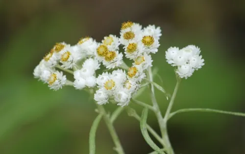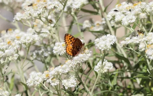 Pearly Everlasting is a perennial herb that stands out for its unique, pearly white flower clusters and silvery, woolly foliage. This plant typically reaches heights of 1 to 3 feet and spreads to form dense clumps. The small, button-like flowers bloom from mid-summer to fall, remaining attractive even after they have dried, making them excellent for dried floral arrangements. Pearly everlasting is particularly valuable for attracting pollinators, especially butterflies, and serves as a host plant for the American Lady Butterfly. It thrives in full sun and well-drained soil, making it suitable for rock gardens, borders, and wildflower meadows where it can naturalize.