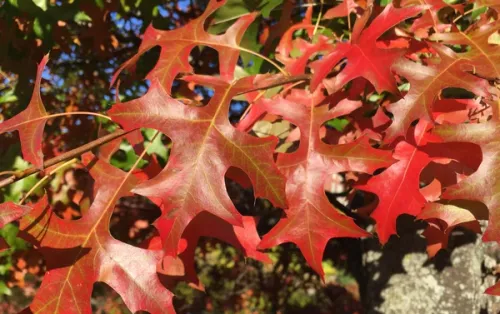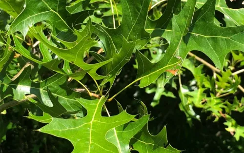 Pin Oak is a fast-growing, deciduous tree that typically reaches heights of 60 to 70 feet, characterized by its distinctive pyramidal form when young, and becoming more oval as it matures. Its leaves are deeply lobed and glossy green, turning to vibrant shades of red and bronze in autumn. In spring, it produces small yellowish-green flowers that are followed by acorns, crucial for feeding wildlife such as squirrels and deer. As with other oaks, Pin Oak is considered a keystone species for the wide range o ecological services it provides. Pin Oak prefers acidic, moist to wet soils, thriving in areas that many other oaks find challenging, such as low-lying landscapes. It's widely used in urban and suburban settings due to its adaptability and striking appearance.