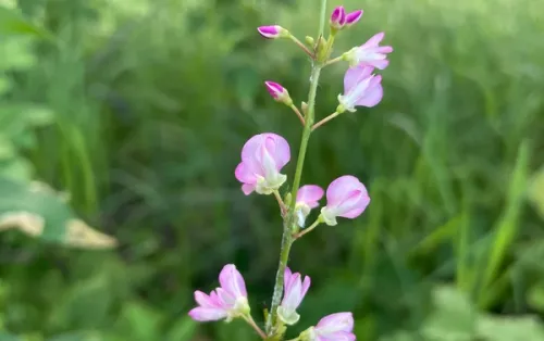Pointed-Leaved Tick Trefoil is a perennial legume that stands out for its ecological contributions and ornamental value. It typically reaches 2 to 4 feet in height, forming upright, branching stems adorned in pointed, three-part leaves. In late summer to early fall, it produces attractive clusters of small, pink to purple flowers, which are highly appealing to bees and butterflies. The flowers develop into sticky, segmented seed pods that readily attach to passing animals, aiding in seed dispersal. This plant is particularly valued for its ability to fix nitrogen in the soil, improving soil fertility. It thrives in partial shade to full sun and prefers moist, well-drained soils.