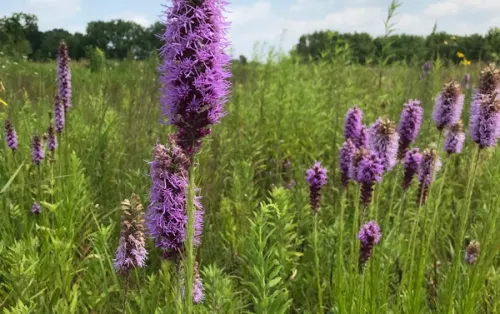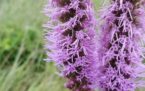 Prairie Blazing Star sends up a whimsical wands of fuzzy pink-purple flowers in midsummer, attracting bees, butterflies, and hummingbirds. This is a particularly striking Blazing Star, with large flowerheads held on feathery stems. It makes an excellent addition to vase. Flowerheads turn fluffy and brown with seeds in winter, resembling cattail seedheads. Goldfinches are fond of the seeds. Prairie Blazing Star can flop, especially in rich soils, so support with tall neighbors or stakes.