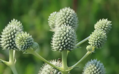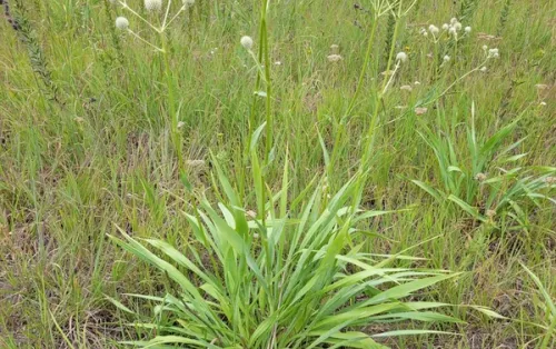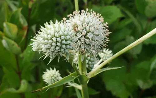 Though Rattlesnake Master is at home in Midwestern prairies, its blue-gray color and upright, spear-shaped leaves make it look like a plant you'd find in the desert! Its blooms are also unique. In mid summer, constellations of spiky white orbs hover over the plants. Rattlesnake Master can seed prolifically on bare open soil, but self-seeding is low if there is mulch or if the garden has grown in. Rattlesnake Master needs the support of nearby plants to remain upright, so it may need staking in the first few years while the garden establishes.
