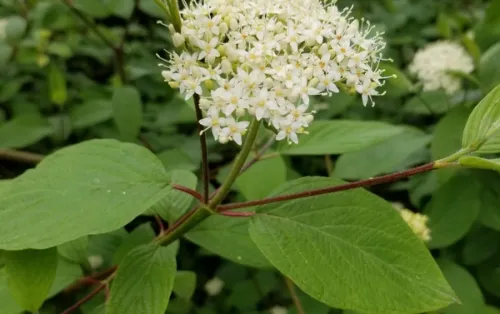 Red-Osier Dogwood is a versatile and hardy shrub that can grow 6 to 9 feet tall. It is especially notable in the winter landscape for its bright red stems, which stand out against snowy environments and support year-round interest. During the spring and summer, this shrub is covered in clusters of small white flowers, followed by white to bluish berries that are attractive to birds and other wildlife. The foliage turns a deep red or purple in the fall, adding another layer of color to the garden. This dogwood thrives in moist, well-drained soils and is often used in wetland restoration, as a hedge, or in rain gardens due to its ability to tolerate and stabilize moist sites.