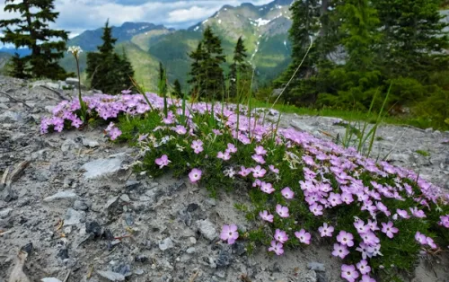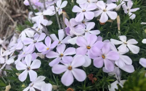 Spreading Phlox, also known as Moss Phlox, is a perennial herb that forms dense mats of needle-like foliage. This low-growing plant, typically only a few inches tall, thrives in high-altitude or rocky environments, making it ideal for rock gardens, crevices, and stone pathways. From late spring to early summer, it produces profuse blooms in a vibrant display of colors ranging from pink and lavender to white. Each flower is small but impactful, creating a dense blanket of color that attracts numerous pollinators, including bees and butterflies. Its ability to thrive in poor, well-drained soils and its drought tolerance once established make it a favorite for challenging sites and xeriscaping.
