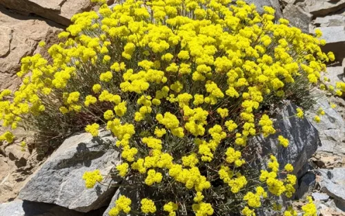 Sulfurflower Buckwheat lives up to its name, producing celebratory plumes of bright yellow flower clusters that bloom from late spring to summer. These blooms later turn a coppery-orange, extending their ornamental appeal. Growing up to 1.5 feet in height and spread, it thrives in full sun and well-drained soil, offering an excellent nectar source for bees and butterflies while adding texture and vibrant color to rock gardens, borders, or xeriscapes.