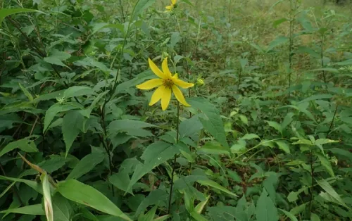 The Ten-Petaled Sunflower is related to the common Annual Sunflower, but unlike its botanical cousin it thrives in dappled shade, grows shorter, and produces multiple flowerheads year after year. Its 3-inch wide yellow flowers, which bloom in late summer, attract a variety of insects. The leaves also feed many insect species, including painted lady caterpillars. Even after the flowers and foliage fade in the winter, Ten-Petaled Sunflower seeds are a valuable food source for birds. In ideal conditions, it can be aggressive, but periodic division can control its spread. In shady or high-fertility gardens, it may flop. Cut the plant back in early summer to prevent this.