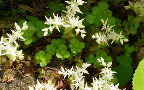 Wild Sedum, also known as Woodland Stonecrop, is distinguished by its lush, spreading mats of small, rounded leaves that stay vibrant throughout the growing season. In late spring, it bursts into bloom with clusters of star-shaped, white flowers that provide a light, airy feel to shaded garden areas. This sedum prefers cooler conditions than its sun-loving relatives, making it ideal for shady, moist spots in the garden, including north-facing sites and under deciduous trees. It's an excellent choice for adding texture and interest to difficult shady areas where other ground covers might not thrive.